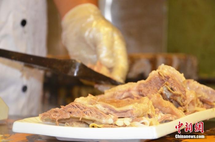 資料圖為8月12日,蘭州主城區(qū)某手抓羊肉招牌老店內(nèi),店員正在切新鮮的東鄉(xiāng)羔羊肉。 中新社記者 李亞龍 攝