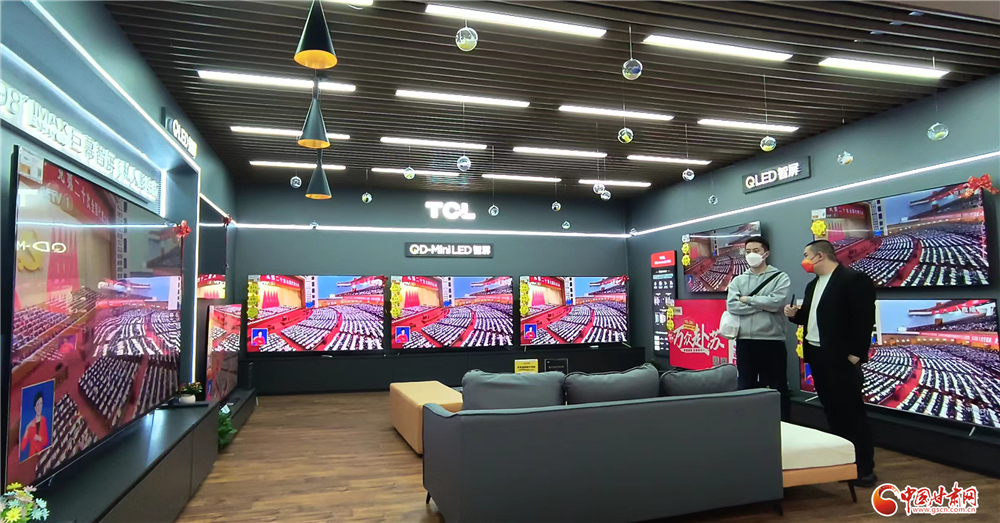 蘭州市西站蘇寧電器賣場,電視墻正在直播中國共產(chǎn)黨第二十次全國代表大會盛況,顧客駐足觀看。