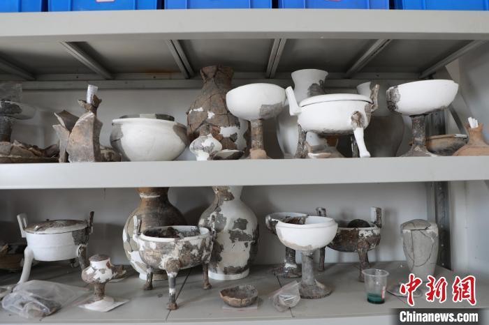 劉勇介紹,考古現(xiàn)場出土的文物碎片,就好比不同的樂高積木混在一起,需要分門別類地梳理出來。每一個編織袋里裝有一件器物,事先已經在考古工地現(xiàn)場進行了初步分類,接著就是清洗清理碎片上的泥土,再而拼接、粘接、補石膏、打磨……