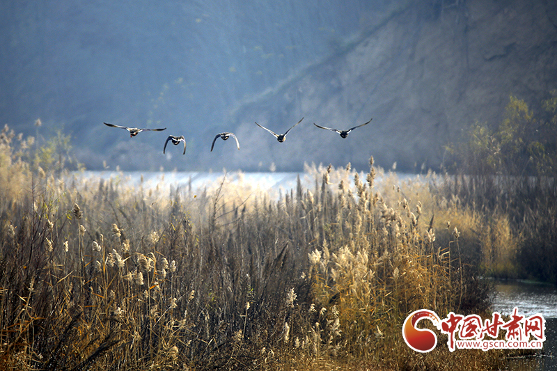 冬日的平?jīng)鍪谐缧趴h,無(wú)人機(jī)鏡頭下的唐帽山山巒疊嶂、俊秀奇威,高大的樹木直插云霄,在云霧繚繞中宛若仙境;汭水河畔,成群的綠頭鴨時(shí)而佇立枝頭,時(shí)而輕舞飛翔,時(shí)而戲水覓食。