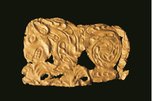 【虎噬羊紋金飾片·戰(zhàn)國·清水縣劉坪出土】工藝技法采用常見的錘碟法,在薄的金片的背面鏨刻虎形,正面隆起,邊緣剪切,四角有釘孔?;⒊识拙嵝危?、鼻、耳、嘴、齒、爪都十分清晰,虎張嘴,伸溝狀前爪抓住一羊。