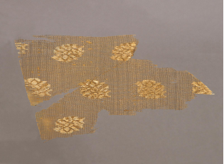 【粧金紗·元代·漳縣汪世顯家族墓出土】該墓葬中同時出土了許多元代的高級絲織品。此件粧金紗就是其中高級緞紋織物的一種。如棕色團花粧金緞、粧金或銀天馬紋緞、粧銀簇花文緞等等。它不僅是罕見的早期緞物標(biāo)本,而且花色品種很多,非常珍貴。