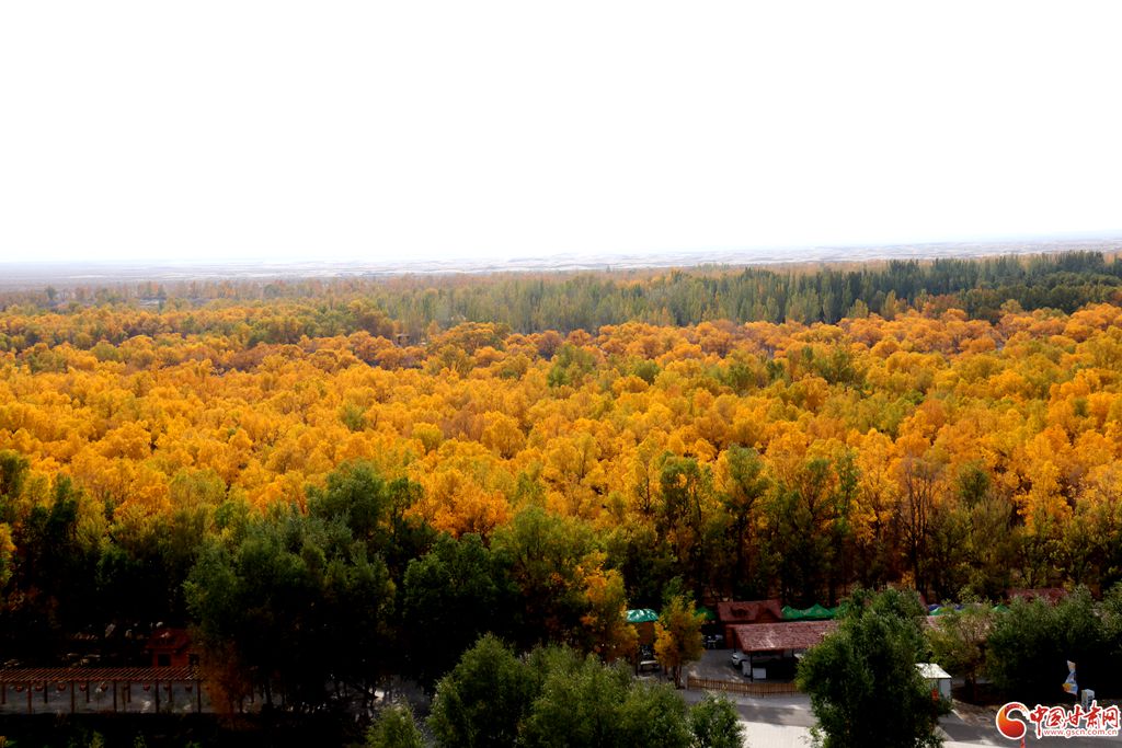 秋高氣爽,金塔沙漠胡楊林景區(qū)進入最佳觀賞期,大片胡楊由翠綠轉成金黃,與湛藍的天空交相輝映。在蒼茫大漠之上,萬畝胡楊層林盡染,形態(tài)各異的胡楊巍然屹立,依水而生。