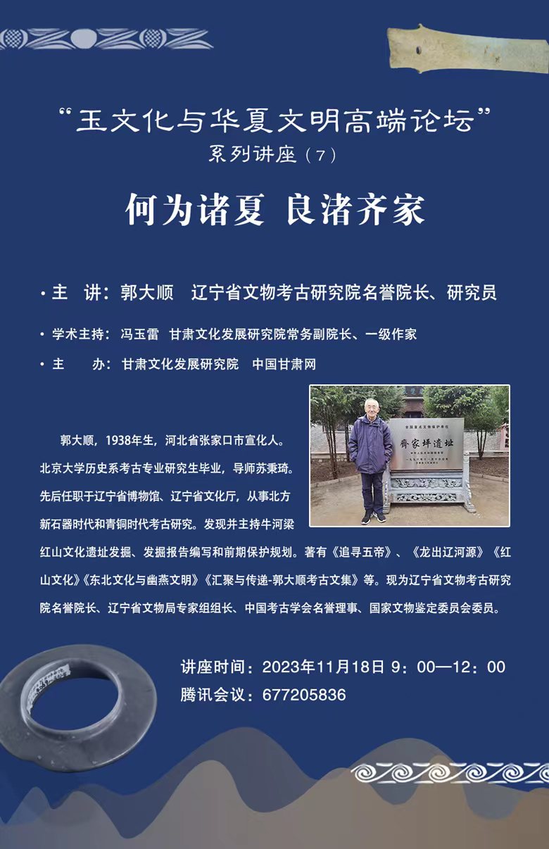 11月18日上午,遼寧省文物考古研究院名譽(yù)院長、遼寧省文物局專家組組長、中國考古學(xué)會(huì)常務(wù)理事郭大順研究員在線上做了題目《何為諸夏,良渚齊家》的學(xué)術(shù)報(bào)告。這是甘肅文化發(fā)展研究院和中國甘肅網(wǎng)聯(lián)合舉辦的“玉文化玉華夏文明高端論壇”系列講座第五講,由甘肅文化發(fā)展研究院常務(wù)院長、一級作家馮玉雷主持,西北師范大學(xué)公選課《中國玉文化》學(xué)子及鄧淑蘋、薛新明、徐琳、王方、韓斝等玉學(xué)家參會(huì)并討論。