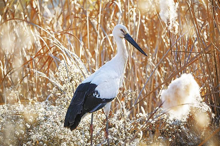 東方白鸛是一種大型涉禽,為鸛形目鸛科鳥類。其體態(tài)優(yōu)美,成鳥體長(zhǎng)超過1米,黑翅白體,赤腳長(zhǎng)喙,棲息于開闊的沼澤、湖泊和潮濕草地。東方白鸛是少見的旅鳥,因繁殖分布區(qū)域狹窄,野生種群數(shù)量極為稀少,在《世界自然保護(hù)聯(lián)盟瀕危物種紅色名錄》中屬于瀕危等級(jí),是我國(guó)一級(jí)重點(diǎn)保護(hù)野生動(dòng)物,有“鳥界國(guó)寶”“鳥類大熊貓”之稱。