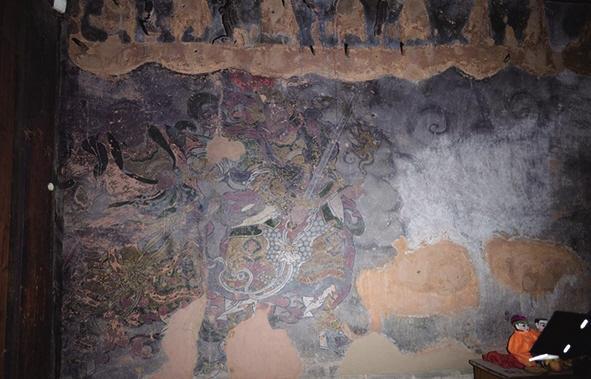 現(xiàn)建筑保存完好,塑像多被破壞,僅存明代懸塑七尊,塑像腳底踩踏祥云,衣帶飄逸靈動,面容栩栩如生。東西兩壁留有四位天神畫像。殿內(nèi)遺留的龐、劉、茍、畢四大雷部元帥門壁畫,與門楣上方的懸塑和拱眼壁上繪畫的尊神,均是研究明代道教藝術(shù)的珍貴遺存,是當(dāng)?shù)厝濉⒌?、佛三教并存,多元文化共同發(fā)展的歷史見證,對研究土司文化具有重要價值。