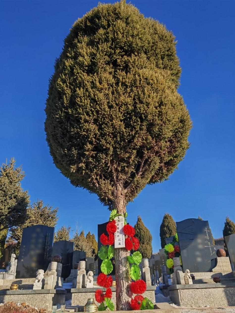 遼寧阜新市公墓的東南角,一棵挺拔翠綠的柏樹樹干上,掛有一個(gè)長(zhǎng)30厘米、寬10厘米的小木牌,上寫有“魏彤欣之墓”,一束花環(huán)環(huán)繞周圍,在陽光的照耀下格外絢麗。