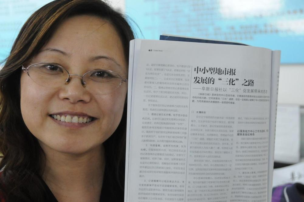 魏彤欣在阜新日?qǐng)?bào)采編大廳留影。