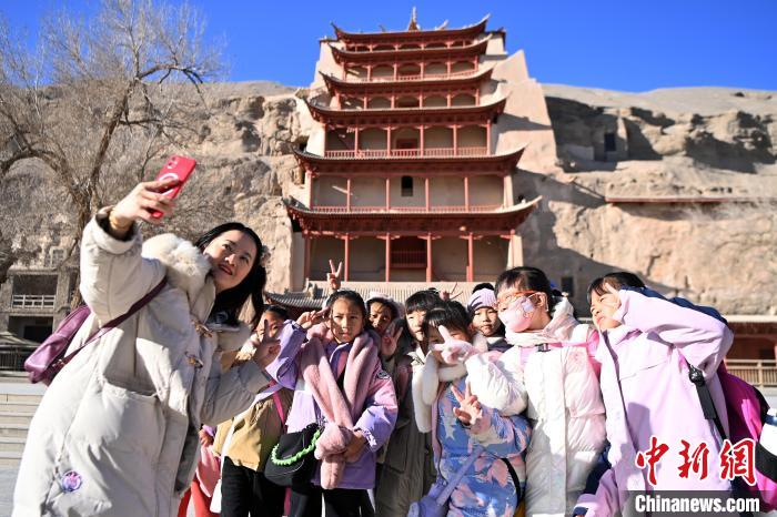 敦煌文化研學(xué)正逐步成為敦煌旅游新時尚,莫高窟成為“研學(xué)養(yǎng)身養(yǎng)心”的學(xué)堂之一。連日來,中新社記者來到冬日的莫高窟,沒有了夏日的人聲鼎沸和如長龍的隊(duì)伍,多了更多青春面孔,穿著絢麗服飾、背著書包的學(xué)生,點(diǎn)綴著沉悶的戈壁土黃色。