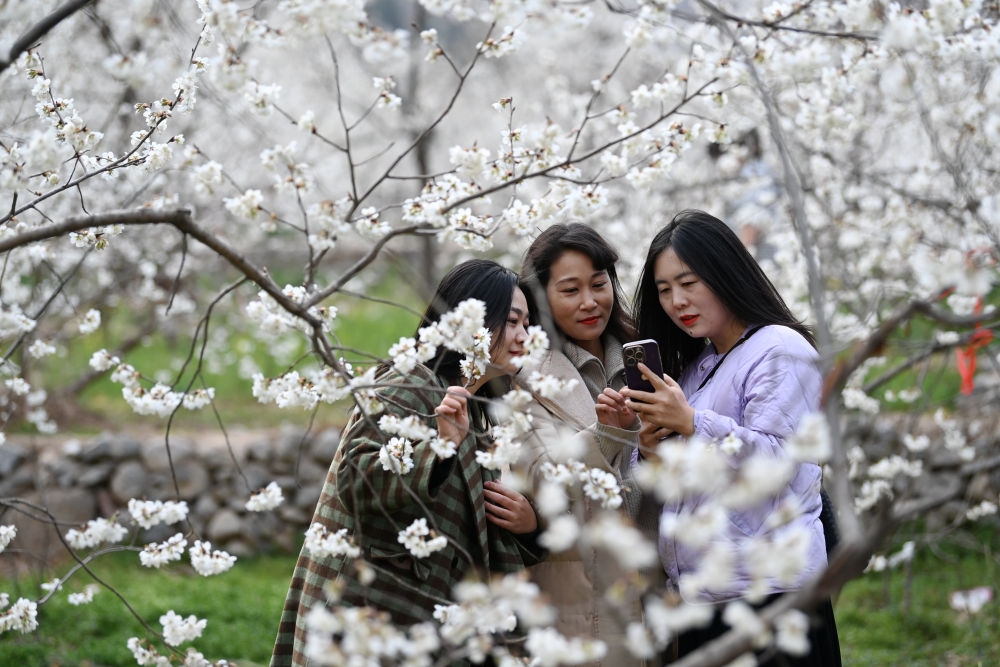 3月9日,幾名游客在隴南市武都區(qū)城關(guān)鎮(zhèn)石家莊村賞花踏青。新華社記者 陳斌 攝