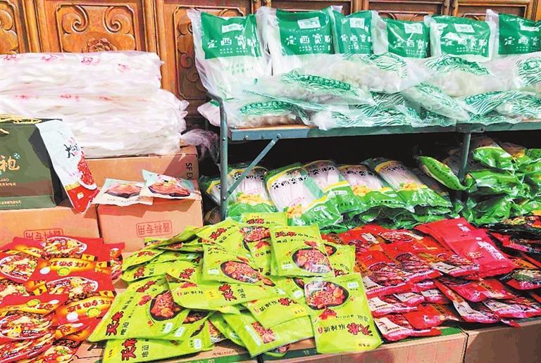 在城門入口的一個(gè)代銷店,各種包裝的麻辣燙底料、定西寬粉吸引了許多游客前來購買。