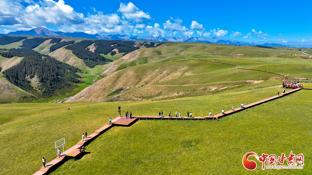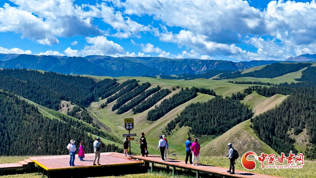 8月3日,祁連山國家公園甘肅省張掖市肅南裕固族自治縣康樂草原段迎來一年最美時光,游客在藍天、白云、森林、草原融為一體的旖旎風光中拍照留念。