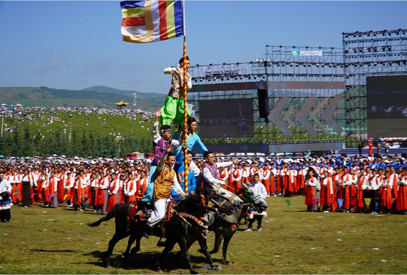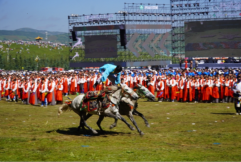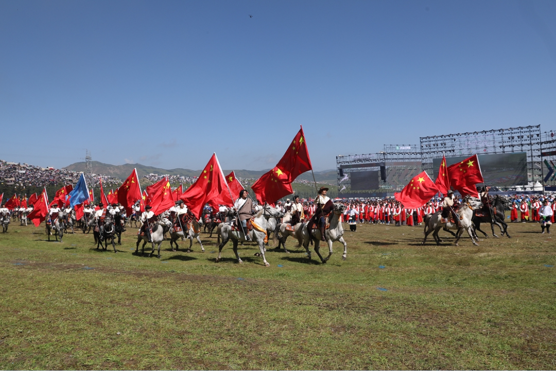 草原騎手乘著矯健的駿馬高舉著鮮艷的五星紅旗從主席臺(tái)前奔馳而過,讓在場的數(shù)萬觀眾贊嘆不已,呈現(xiàn)出一個(gè)絢麗多彩的甘南、和諧穩(wěn)定的甘南、朝氣蓬勃的甘南、包容開放的甘南、團(tuán)結(jié)奮進(jìn)的甘南。