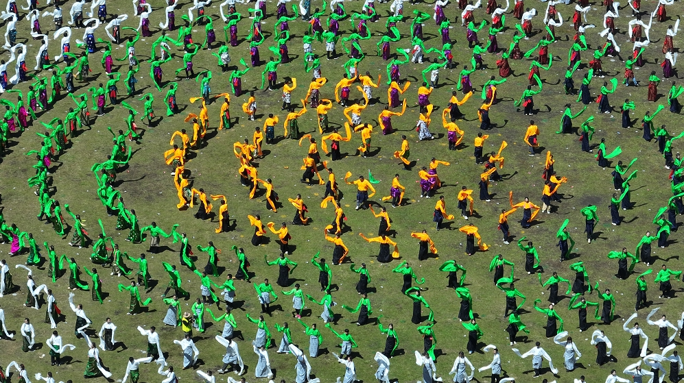 在歡快優(yōu)美的樂曲聲中,萬人鍋莊開始展演,動(dòng)聽的樂曲、颯爽的舞姿、五彩的服裝,將甘南的生態(tài)之美、文化之美、民俗之美、和諧之美展示得淋漓盡致。圓圈形的鍋莊舞表達(dá)了甘南人民在中國共產(chǎn)黨領(lǐng)導(dǎo)下,各民族像石榴籽一樣緊緊擁抱在一起,為推動(dòng)甘南高質(zhì)量發(fā)展,畫出最大同心圓。