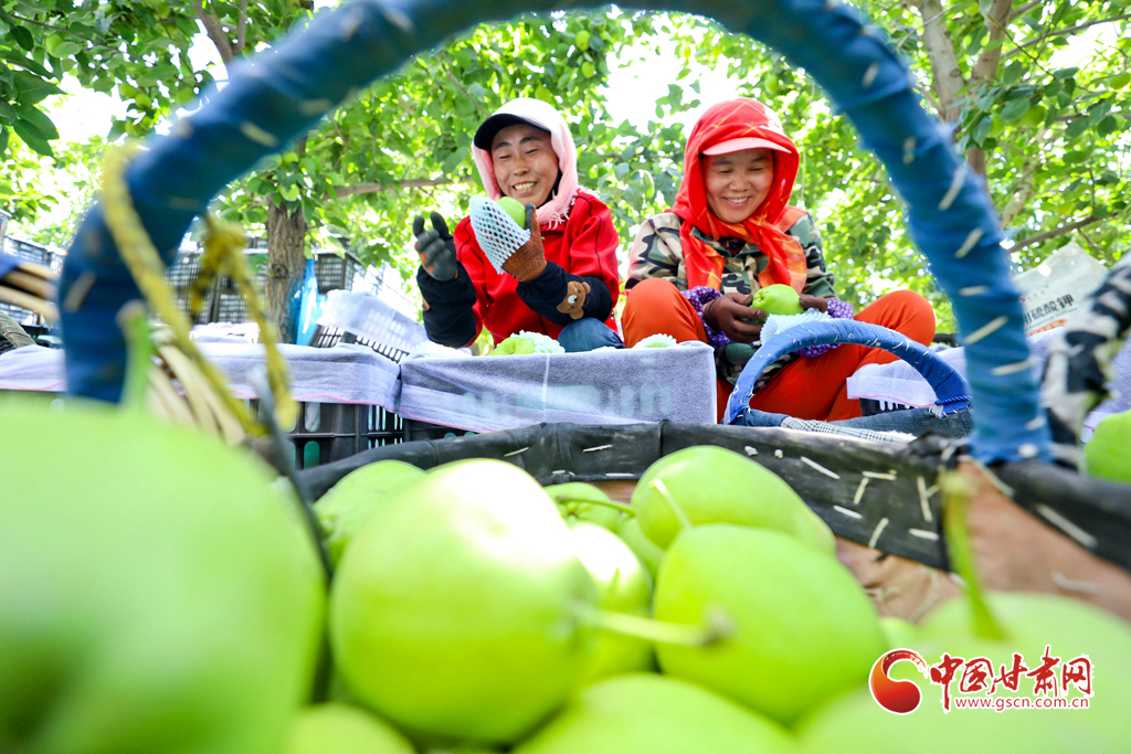 8月12日,在張掖市甘州區(qū)農(nóng)墾張掖農(nóng)場綠色果品種植基地,果農(nóng)們正在采摘成熟的早酥梨,基地里一派果豐人忙的喜人景象。