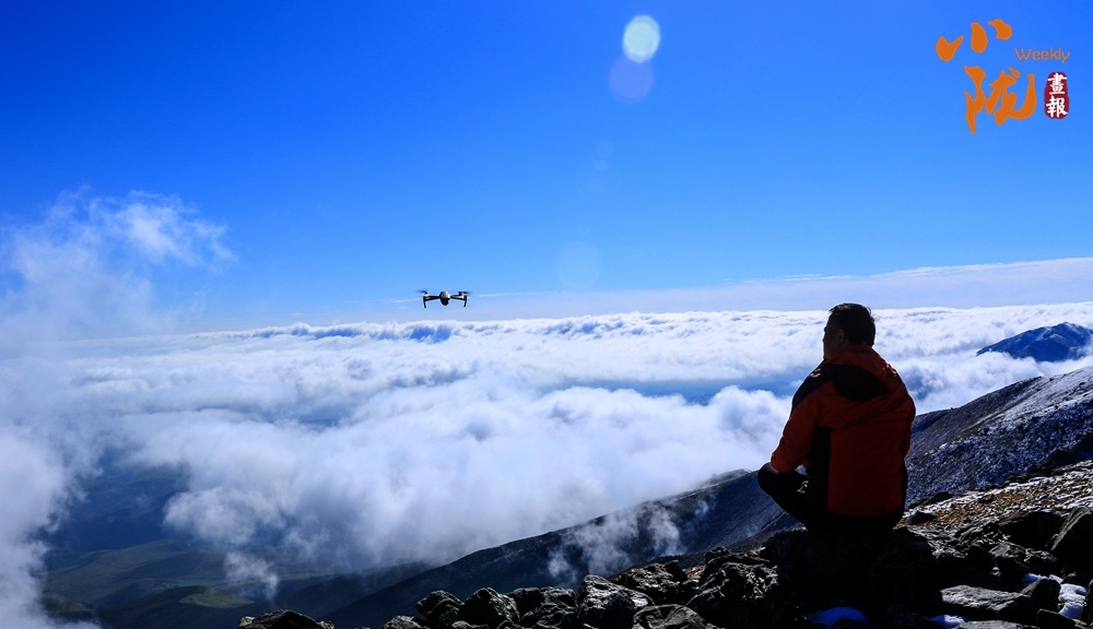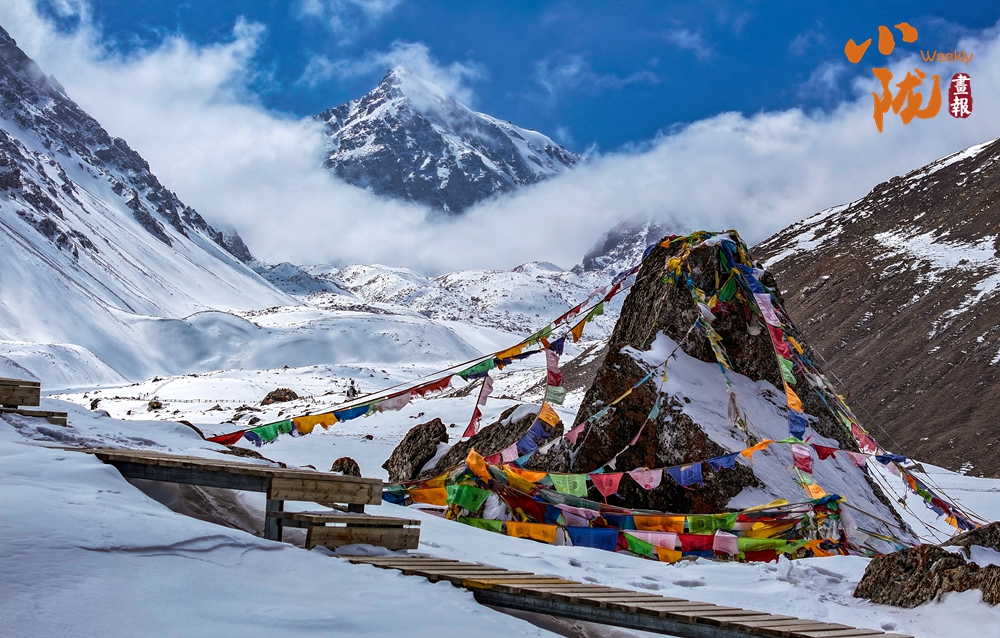 雪山山巒間,云霧回旋飄動,彌漫舒展,如海浪起伏、波濤滾滾一般,與湛藍(lán)天空相互映襯,壯美如畫。