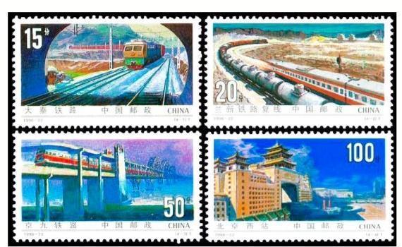 1996年9月,我國發(fā)行編號(hào)為1996-22的《鐵路建設(shè)》郵票一套四枚,其中T4-2圖為蘭新鐵路復(fù)線。票面上,一貨一客兩列火車蜿蜒在蘭新鐵路復(fù)線,氣勢如虹。而嘉峪關(guān)關(guān)城作為一個(gè)地理標(biāo)志,被處理成蘭新鐵路復(fù)線的背景圖案,放在郵票主圖的后方。盡管由于票面所限,背景圖案上的嘉峪關(guān)關(guān)城畫面很小,無以淋漓盡致地表現(xiàn)嘉峪關(guān)城樓的細(xì)節(jié),但其“天下第一雄關(guān)”的雄姿絲毫不減。而嘉峪關(guān)出現(xiàn)在表現(xiàn)甘肅特色乃至蘭新交通主線的票面上,也足見其地理位置的重要性。