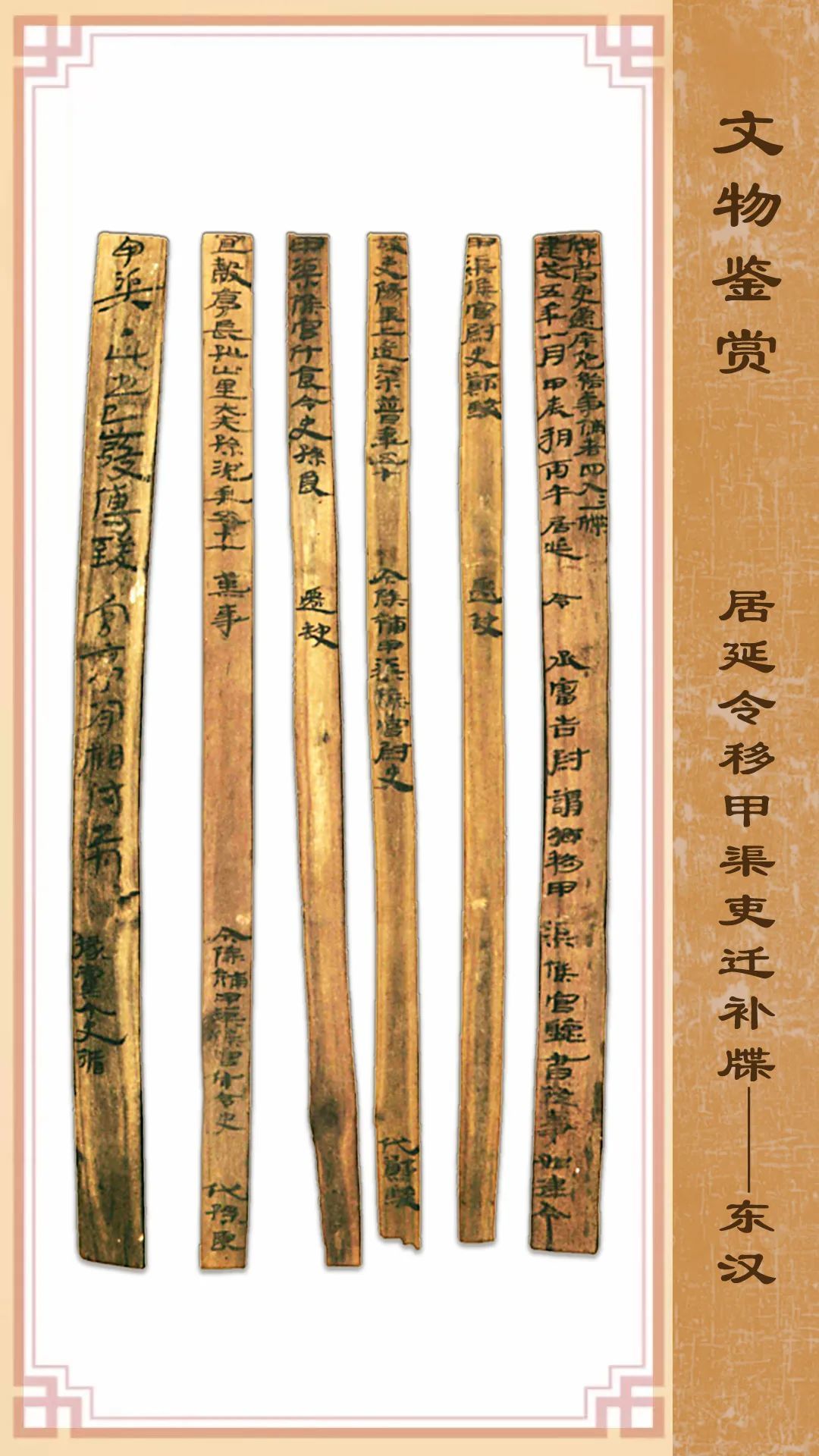 此簡(jiǎn)牘1974年出土于甲渠候官遺址第22號(hào)房址。簡(jiǎn)冊(cè)一共5枚,是一份東漢建武五年八月甲辰(公元29年8月31日)由居延縣令簽發(fā)的一份官吏任免草擬文件。簡(jiǎn)牘均長(zhǎng)22.7厘米,其中第1枚寬1.6厘米,其余4枚寬1厘米,存字141字。
