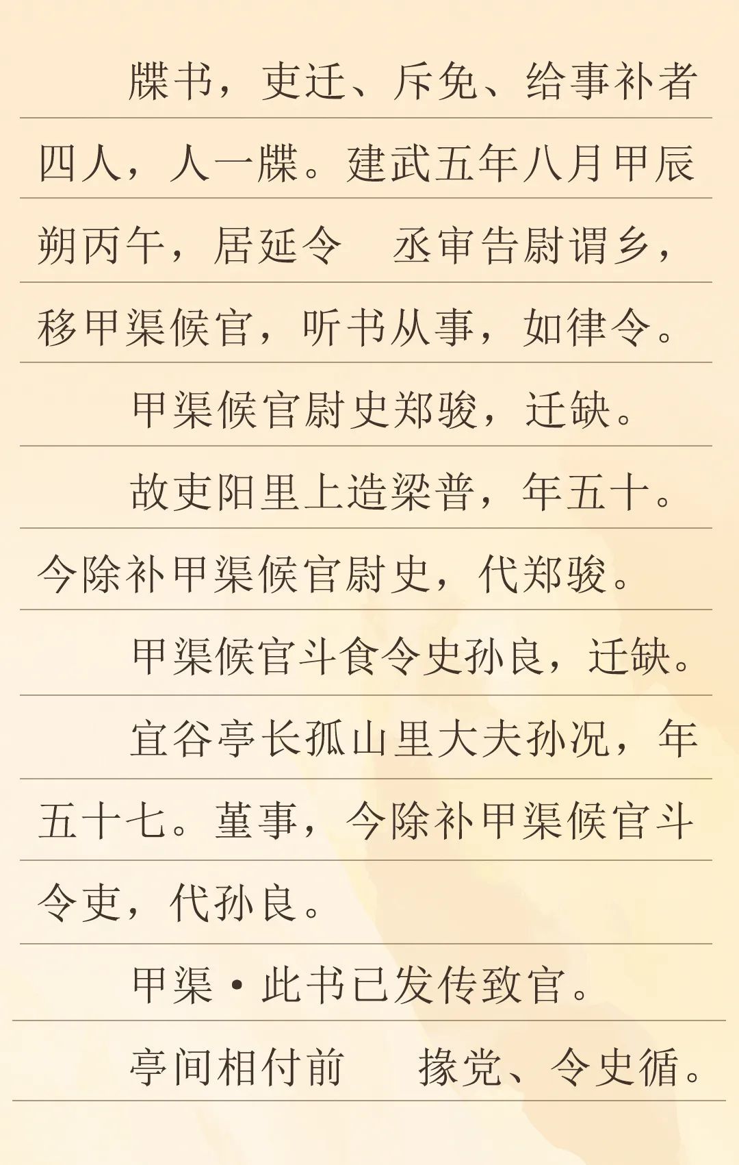 這是一份距今1995年的地方官員任命書。當(dāng)時(shí)是東漢建武五年八月,在漢代張掖郡居延邊塞的甲渠候官進(jìn)行了人事調(diào)整,對(duì)官吏進(jìn)行了任免。一個(gè)是甲渠候官尉史鄭駿升遷,由五十歲的梁普補(bǔ)缺;另一個(gè)是甲渠候官斗食令史孫良升遷,由五十七歲的原宜谷亭長(zhǎng)孫況代任,其中提到孫況做人低調(diào)、行事嚴(yán)謹(jǐn)(即“謹(jǐn)事”)。這次人事調(diào)整是由居延縣負(fù)責(zé)。