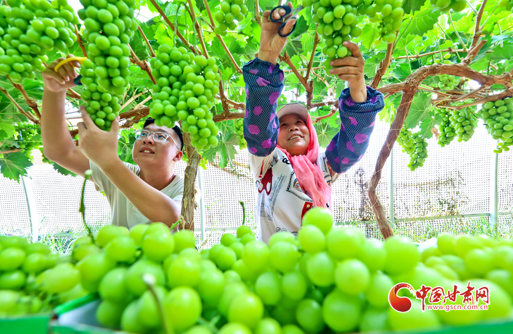 8月28日,在高臺縣南華鎮(zhèn)智號村1000畝陽光玫瑰葡萄綠色標準化產(chǎn)業(yè)園內(nèi),40多萬斤陽光玫瑰進入成熟采摘期,果農(nóng)們正在采摘、分揀、裝箱,準備發(fā)往浙江、江蘇、新疆、青海、內(nèi)蒙古等地客商的手中。