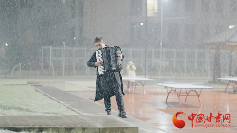 鏡頭中,在蘭州大學榆中校區(qū),手風琴聲伴隨著雪花,一位同學在雪中輕輕擺動著身體,引得過路的同學駐足欣賞。