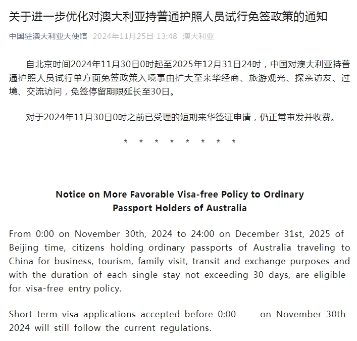 據(jù)“中國駐澳大利亞大使館”微信公眾號消息,自北京時間2024年11月30日0時起至2025年12月31日24時,中國對澳大利亞持普通護照人員試行單方面免簽政策入境事由擴大至來華經(jīng)商、旅游觀光、探親訪友、過境、交流訪問,免簽停留期限延長至30日。