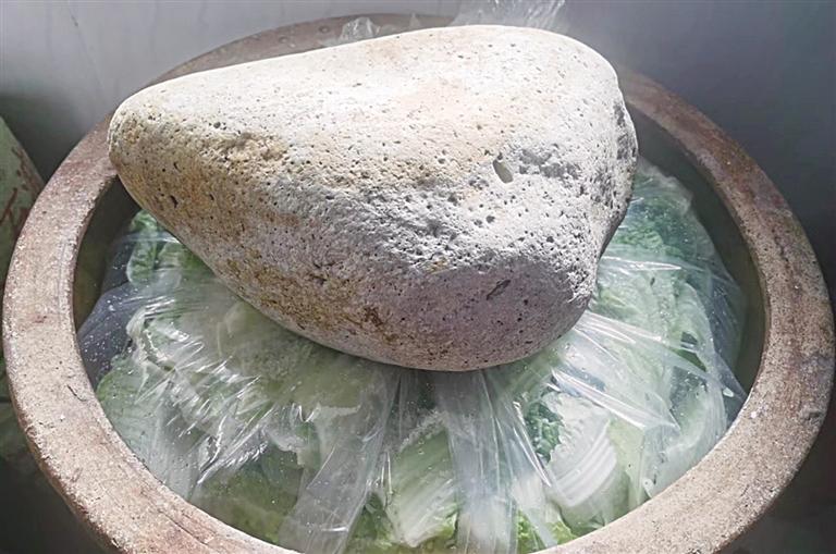 交談中,菜市場(chǎng)爺爺奶奶輩的老人說(shuō),除了囤好大白菜,“一口酸菜缸,一塊腌酸菜用的大石頭”也必不可少。“前一年缸里的菜吃完后,要把空缸倒扣在地面上,接上地氣,除去缸中的異味,然后洗干凈,晾干,來(lái)年再用。”老人家說(shuō),傳統(tǒng)的近半人高的醬色大缸一般都是家里的老人留下來(lái)的,那時(shí)候大家的生活條件不好,一家人的美食,都被腌制在壇壇罐罐里,甚至搬家都舍不得丟棄這口缸。腌菜用的壓菜石也是有講究的,先要夠分量,太小了壓不實(shí),太大了不方便取菜,也有人常常用幾塊卵石同時(shí)壓菜的辦法來(lái)解決;最好還要表面光滑、不扎手、好清洗,“基本都是黃河邊撿的石頭拿回去洗干凈用”。
