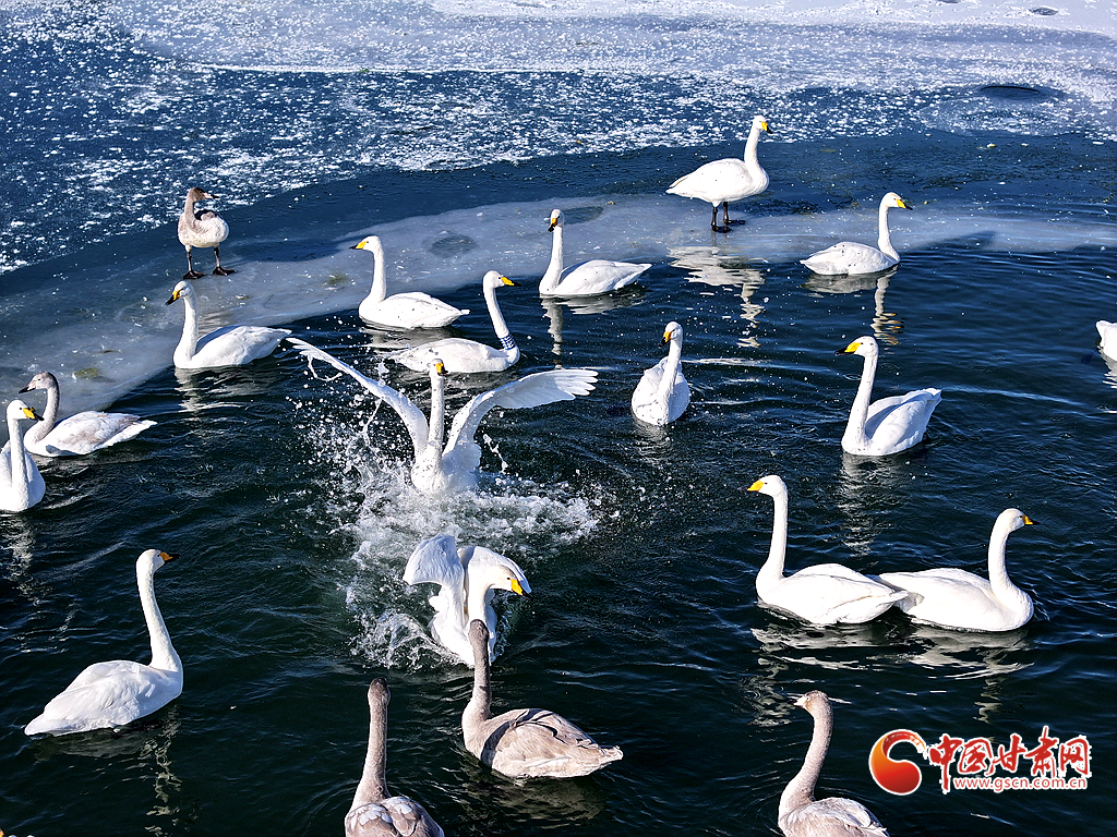 近日,在甘肅省張掖國(guó)家濕地公園,成群的越冬天鵝在冰封的湖面上悠然覓食、嬉戲,構(gòu)成了一幅動(dòng)人的生態(tài)畫卷,成為冬日里一道尤為引人注目的風(fēng)景線。