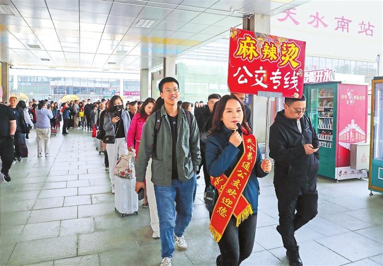 2024年4月3日,志愿者在天水南站引導(dǎo)游客乘坐免費的“麻辣燙公交專線”。新甘肅·甘肅日報記者 高檣