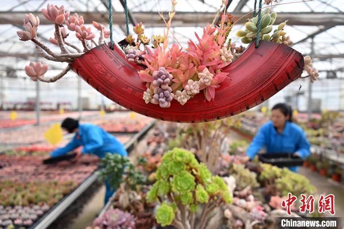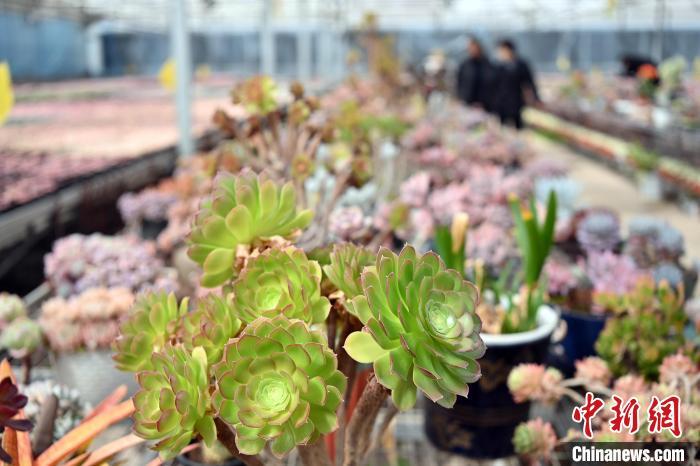 3月12日,在甘肅省蘭州市紅古區(qū)鑫源現(xiàn)代農業(yè)科技示范園種植大棚內種植的多肉植物。中新社記者 九美旦增 攝