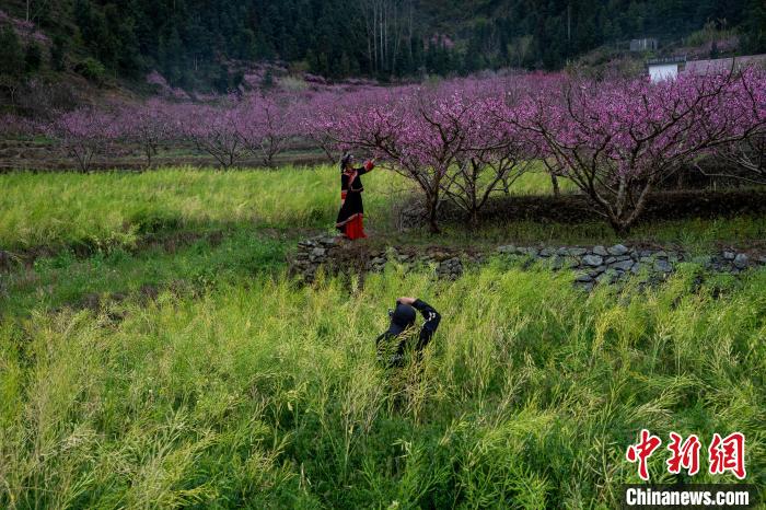 時(shí)下正是桃花盛開的時(shí)節(jié),在廣西田林縣浪平鎮(zhèn)浪平村,村民種植的桃花競相綻放。滿樹繁花與錯(cuò)落村舍相互映襯,還有樹旁玩耍的孩童、樹下勞作的村民,動靜交織,構(gòu)成一幅絕美的田園春景圖。圖為3月15日,在廣西田林縣浪平鎮(zhèn)浪平村,村民在桃樹下勞作。黃數(shù)情 攝