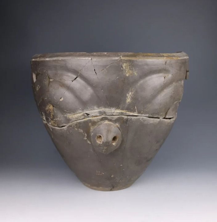 然而,馬家窯人的藝術(shù)創(chuàng)造力似乎遠(yuǎn)不止于此。寺洼遺址新出土的眾多陶器展現(xiàn)出全新的造型與紋飾風(fēng)格。如其中一件帶有“豬鼻”的馬家窯類型泥質(zhì)灰陶,色澤深沉灰黑如夜,一只鼻子自陶胎中緩緩隆起,上方的弧形紋理像舒展的眉骨,又像張開的羽翼,一場(chǎng)古文明的夢(mèng)境由此展開。