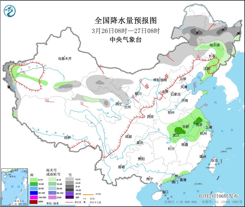 3月26日08時至27日08時,內(nèi)蒙古東部、黑龍江大部、吉林東部、新疆南疆西部山區(qū)、甘肅河西、青海北部等地部分地區(qū)有小到中雪或雨夾雪,其中,內(nèi)蒙古東北部、黑龍江中東部、新疆南疆西部山區(qū)等地部分地區(qū)有大雪(5~9毫米)。吉林中部、遼寧東部、江淮大部、江漢東部、江南北部、廣東南部沿海等地部分地區(qū)有小雨,其中,湖北東部、安徽中部、江蘇西南部等地部分地區(qū)有中雨。內(nèi)蒙古大部、西北地區(qū)中東部、華北大部、東北地區(qū)西部、新疆南疆盆地等地部分地區(qū)有4~6級風(fēng)。內(nèi)蒙古中西部、寧夏等地部分地區(qū)有揚(yáng)沙。
