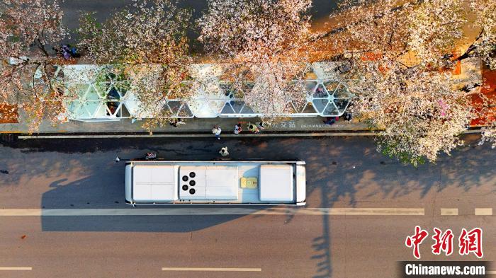 3月26日,被譽為武漢“最美櫻花車站”的珞喻東路大黃村公交站櫻花盛放。經(jīng)過改造的大黃村公交站,新增了自助售貨機、衛(wèi)生間、共享充電寶等便民設施,煥然一新的科技智慧站臺與粉白如霞的櫻花相映生輝。微風吹過,櫻花花瓣浪漫飄零,吸引不少市民游客觀賞“打卡”。圖為公交車在珞喻東路大黃村公交站停留。(無人機照片)劉康 攝