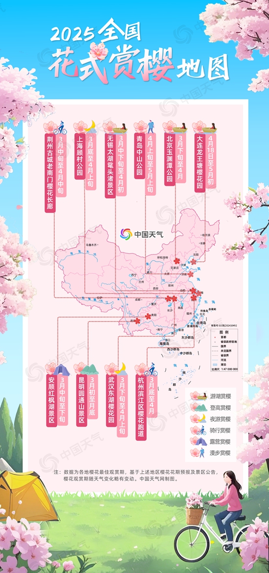 春季天氣多變,冷空氣不時“刷存在感”。眼下一場寒潮天氣正在影響我國,江南多地春雨即將上線,北方大風(fēng)天氣頻繁,風(fēng)雨一來櫻花容易被吹落,賞花還需把握時機。南方的小伙伴不妨在寒潮到場前,安排一場夜游賞櫻,別有一番浪漫;北方的中晚櫻還未大面積開放,小伙伴們可以等寒潮結(jié)束后將第二波賞櫻日程計劃上,別錯過這浪漫的櫻花季。(文/江漪 設(shè)計/王維一 數(shù)據(jù)支持/孫倩倩 審核/劉文靜 余曉芬)