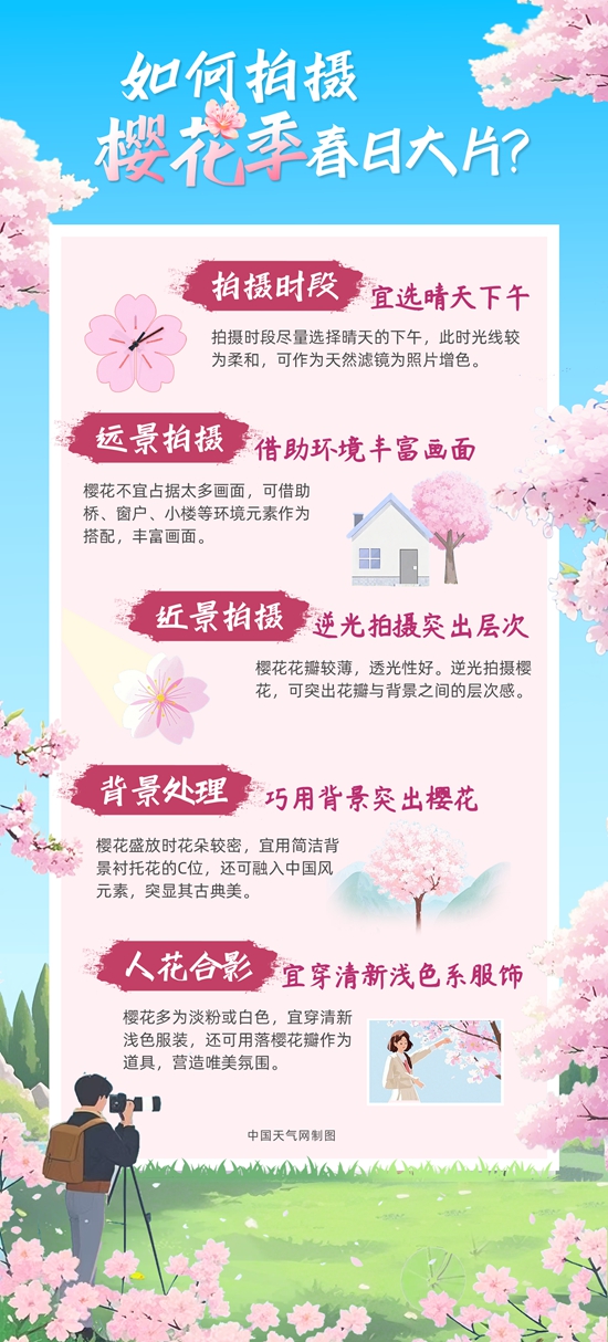 櫻花盛放燦若云霞,但花季卻十分短暫,拍照是留住櫻花之美的絕佳方法之一。如何捕捉櫻花的層次感?人花合影如何營造浪漫氛圍感?中國天氣網(wǎng)從景別、構(gòu)圖、拍攝時段等方面總結(jié)了拍攝小貼士,助你拍出絕美春日大片。
