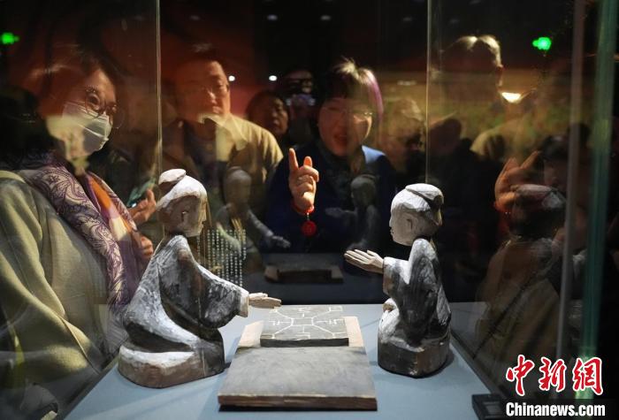 3月30日,觀眾在講解員的引導下欣賞甘肅省博物館藏的西漢彩繪木六博俑?!∈反宏枖z