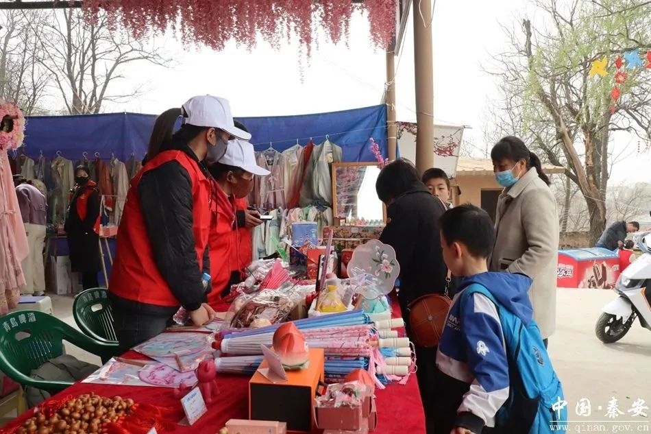 文創(chuàng)攤位前同樣人氣爆棚。精美的桃花折扇、雕花書簽、桃花傘,印著大地灣文化IP“小祖宗”的帆布包,寓意吉祥的桃木雕刻,以及麥稈編、剪紙等非遺手工藝品,每件都承載著秦安文化底蘊。攤主熱情地為顧客介紹產(chǎn)品的來歷與寓意,偶爾還會講述一些背后的創(chuàng)作背景故事,引得大家頻頻點頭稱贊。