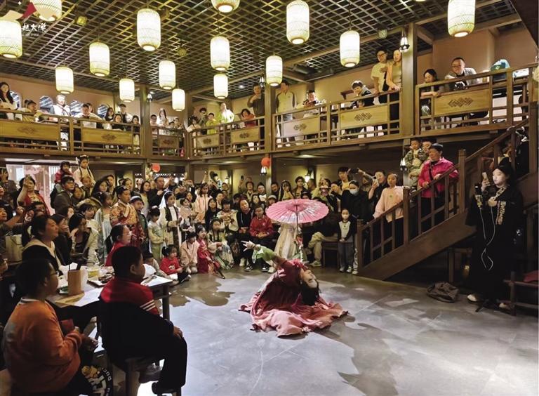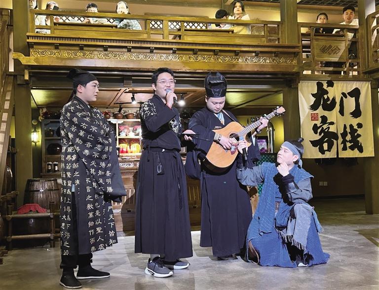 “諸位小友近來可好?”“好!”在街區(qū),NPC們與游客的互動成為一大亮點。為了讓游客更好地沉浸其中,街區(qū)里的“蘭裳閣”專門提供服裝出租和妝造設(shè)計服務(wù)。游客們在這里換上漢服、做好造型,“穿越”成古人與NPC們共同沉浸在這場歷史旅行中。張偉彥在“龍門客棧”工作快半年了,飾演店小二馬一刀。他對角色有著自己的理解:“導(dǎo)演讓我演店小二,大家印象里店小二都是機靈、腿腳快的。但我演的這個店小二帶著江湖氣息,他藏在龍門客棧,其實是個刀客,在這里打工是為了打探消息,畢竟龍門客??墒墙⒌木奂?。”記者走在街區(qū),時不時就能看到他拿著草帽,熱情地招呼游客玩接帽子游戲。遇到靦腆不敢嘗試的游客,他也會不斷鼓勵,有時候碰上外國游客,他還隨口說幾句英語與其互動。