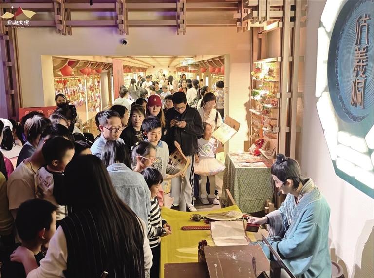 來自北京的游客李曉娜和朋友黃怡夢慕名來到“風起大漢”,玩得不亦樂乎。李曉娜說:“我朋友特別喜歡漢服,在這里穿著漢服拍照特別出片。而且街區(qū)里的節(jié)目都很有意思,我們最喜歡張騫的押寶館,玩游戲還能贏小禮品,特別有趣!”