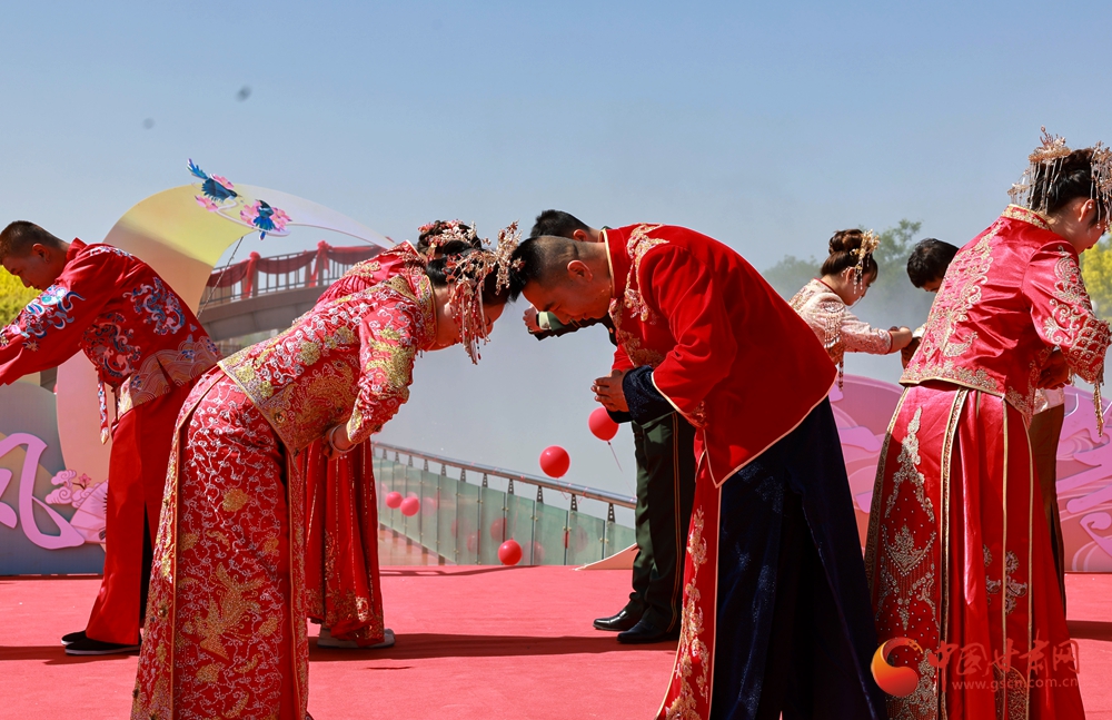 活動現(xiàn)場,古色古香的布置與悠揚(yáng)婉轉(zhuǎn)的禮樂相得益彰。參加集體婚禮的新郎、新娘走過連心橋,共同牽繡球入場,舉行拜天地、行合巹禮等傳統(tǒng)儀式,一揖一禮間盡顯中式婚禮的莊重典雅與浪漫情懷,每一個(gè)環(huán)節(jié)都飽含著對新人的美好祝福。