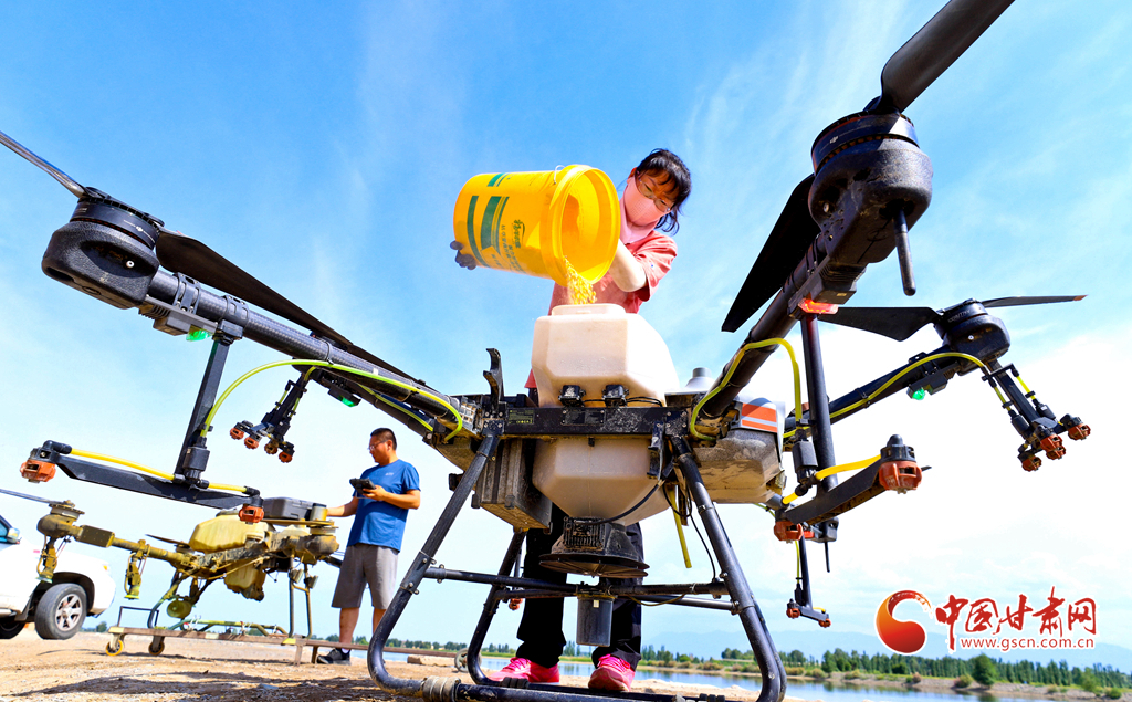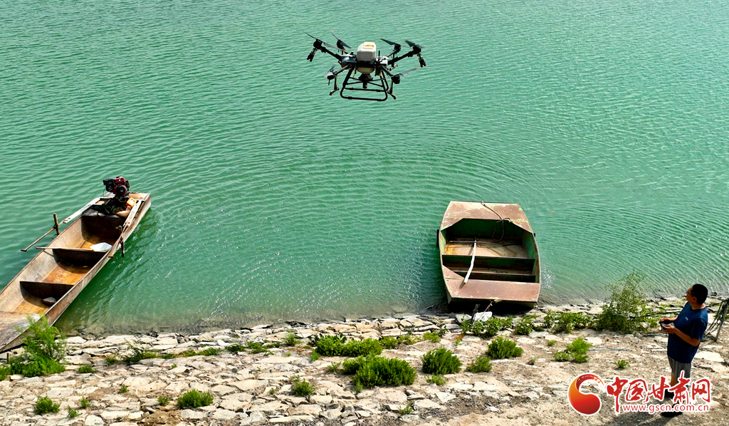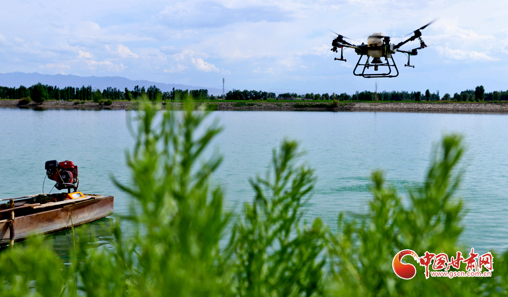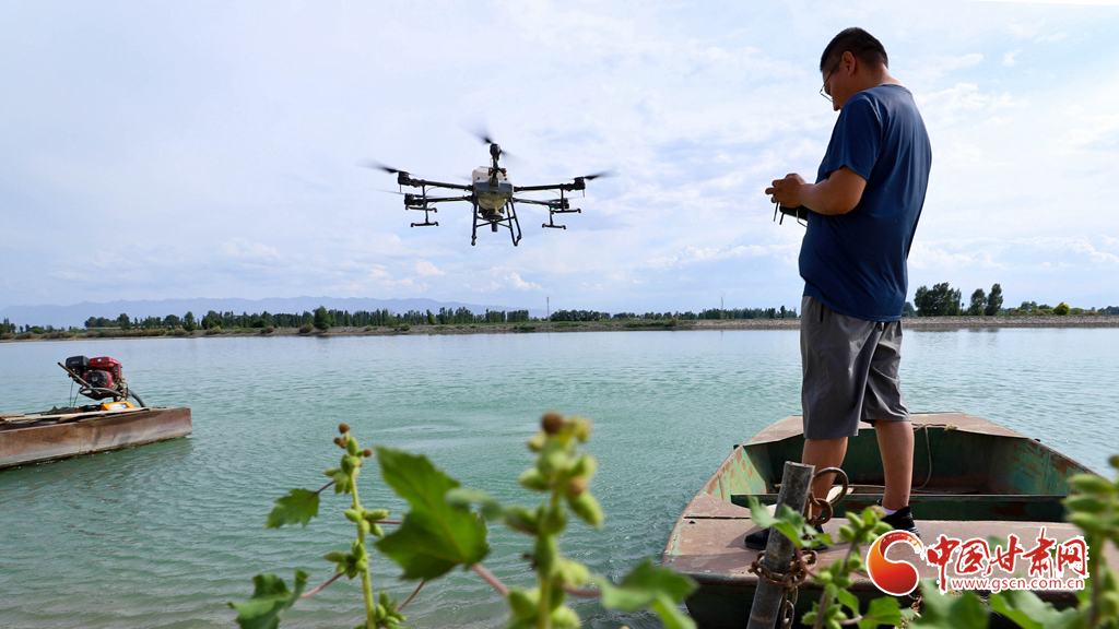 6月24日,在高臺(tái)縣夾溝湖水庫螃蟹養(yǎng)殖基地,無人機(jī)操作手啟動(dòng)設(shè)備,載滿飼料的無人機(jī)沿預(yù)設(shè)航線在800多畝螃蟹養(yǎng)殖基地上空精準(zhǔn)投喂。