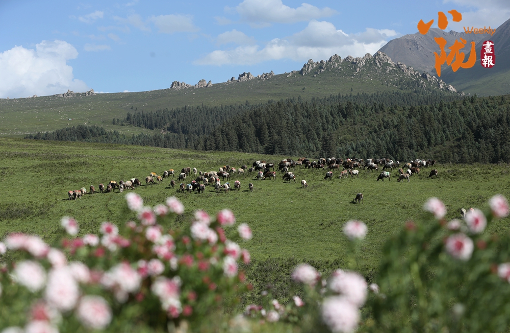 祁連下的康樂草原,是肅南裕固族人生活的地方。這里風光秀美,山地高原交相呼應,丘陵漫甸連綿起伏。放眼周圍,遠處祁連山巍峨挺拔,近處樹木郁郁蔥蔥,優(yōu)美壯觀。