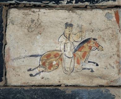 它的“不一般”,首先在于其“極簡(jiǎn)卻傳神”的藝術(shù)風(fēng)格。該磚的畫面以赭石色為底,墨線寥寥,卻生動(dòng)勾勒出一位策馬疾馳的驛使:頭戴魏晉幘帽,身著右衽短衫,左手控韁,右手舉著文書。而駿馬則四蹄騰空,動(dòng)態(tài)感十足,一種風(fēng)馳電掣的緊迫感似從畫中撲面而來(lái)。更耐人尋味的是,畫師刻意省略了驛使的嘴巴:這一“殘缺”設(shè)計(jì),并非疏忽,而是古人智慧的體現(xiàn),象征著郵驛制度中“守口如瓶”的保密原則,使其成為中國(guó)古代信息保密文化的生動(dòng)見(jiàn)證。