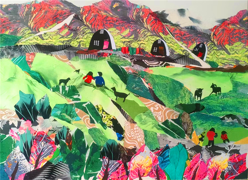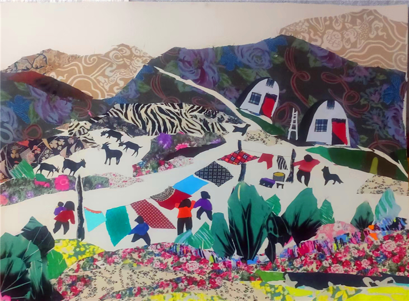 裁剪環(huán)節(jié)更見功力。她以“銳利”之心駕馭剪刀,根據(jù)畫面需求將碎布剪成不同形狀,有的需棱角分明,有的要圓潤柔和。粘貼時,她摒棄簡單的粘合方式,采用傳統(tǒng)縫補與現(xiàn)代鑲嵌相結合的技法,讓布料與底板緊密貼合,既保證了作品的耐久性,又營造出自然的浮雕感。在《黃土風情》布貼畫中,她用層層疊疊的碎布表現(xiàn)黃土高原的溝壑縱橫,用深淺不一的色塊勾勒窯洞的錯落有致,指尖翻飛間,碎布頭便有了筋骨與神韻。