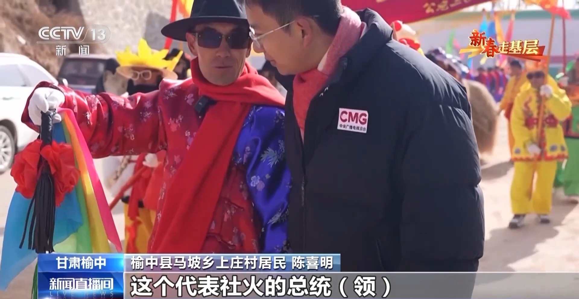 榆中縣馬坡鄉(xiāng)上莊村居民 陳喜明:這個(gè)代表社火的總統(tǒng)領(lǐng),是給我們引場(chǎng)子的,社火就是把大家召集到一起,前段時(shí)間這里遭災(zāi),搞個(gè)社火把大家的精神提一提。